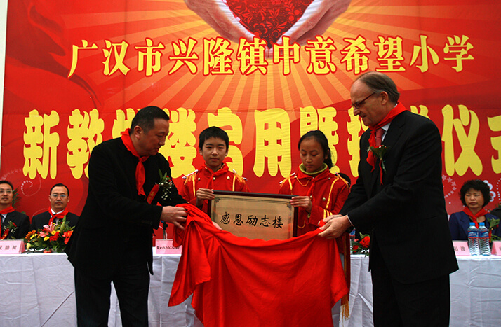 2008年"5.12大地震"發(fā)生后僅兩日,中意人壽即決定以公司名義向中國紅十字會捐款30萬元,幫助災區(qū)同胞度過難關。此外,中意人壽員工也積極響應,紛紛慷慨解囊,向中國紅十字會捐款21萬余元。后中意人壽又以公司名義捐款50萬元,通過四川省青少年發(fā)展基金會于2009年在四川省廣漢市興隆鎮(zhèn)建設"中意希望小學",幫助四川地震災區(qū)的孩子們重返校園。