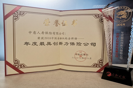 中意人壽在金融時報社與中國社會科學院金融研究所主辦的“中國金融機構(gòu)金牌榜●金龍獎”活動中獲得“2018年度最具創(chuàng)新力保險公司”的殊榮。